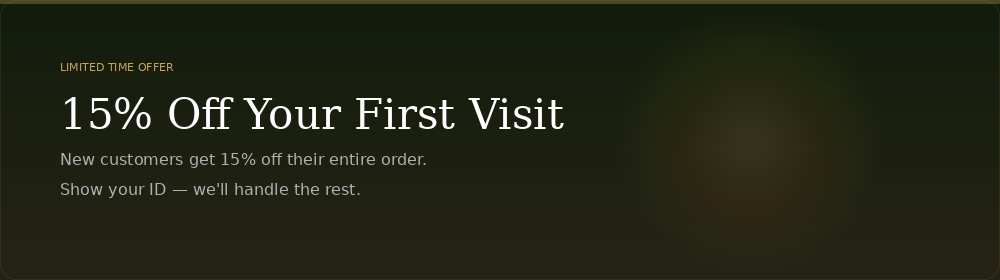 Enjoy 15% off your entire order when you shop with us for the first time. Just show your ID — our budtenders handle the rest.